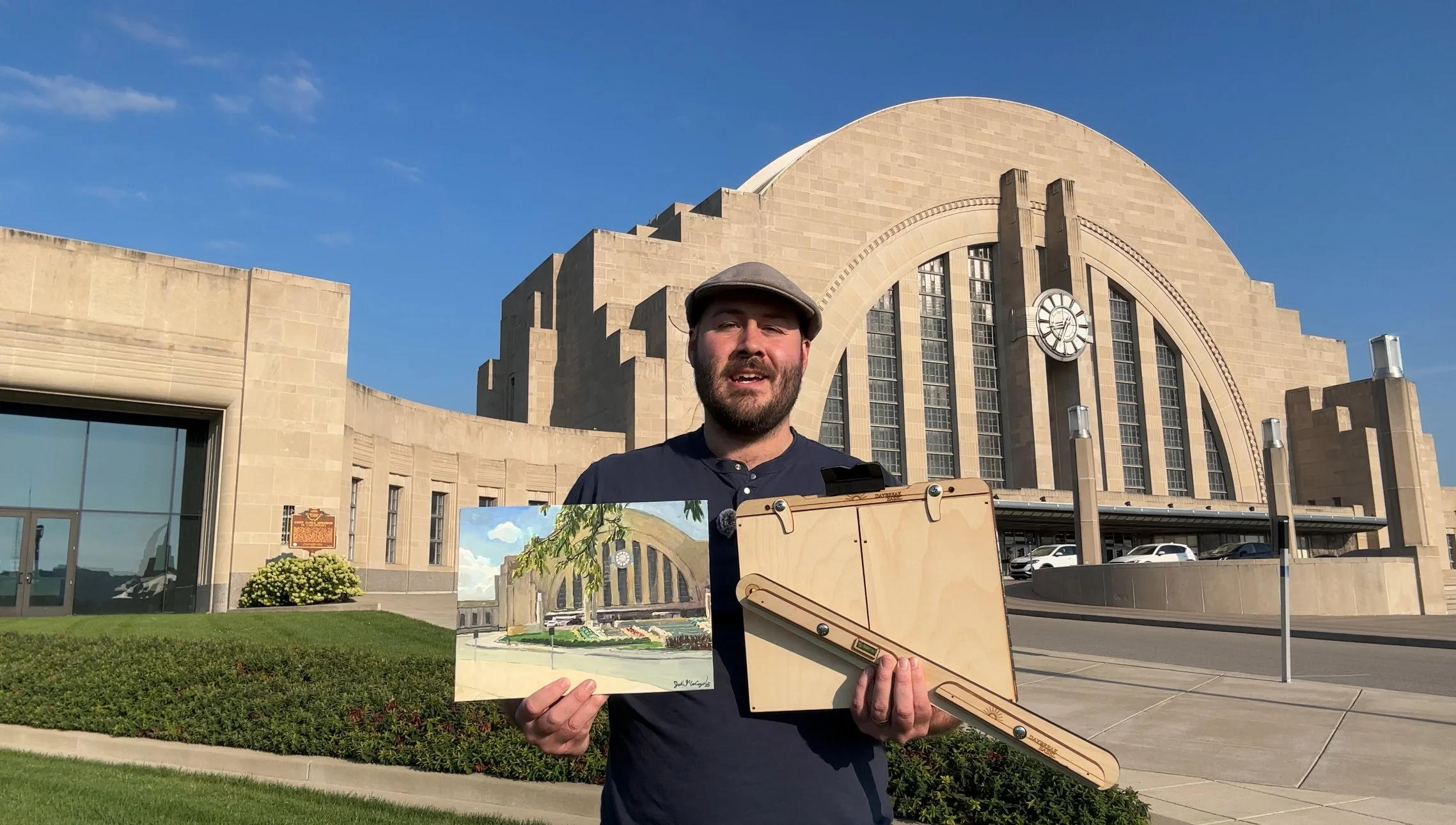 Still from the review video showing me holding my finished plein air painting of Union Terminal with the Daybreak Easel and the iconic building visible in the background