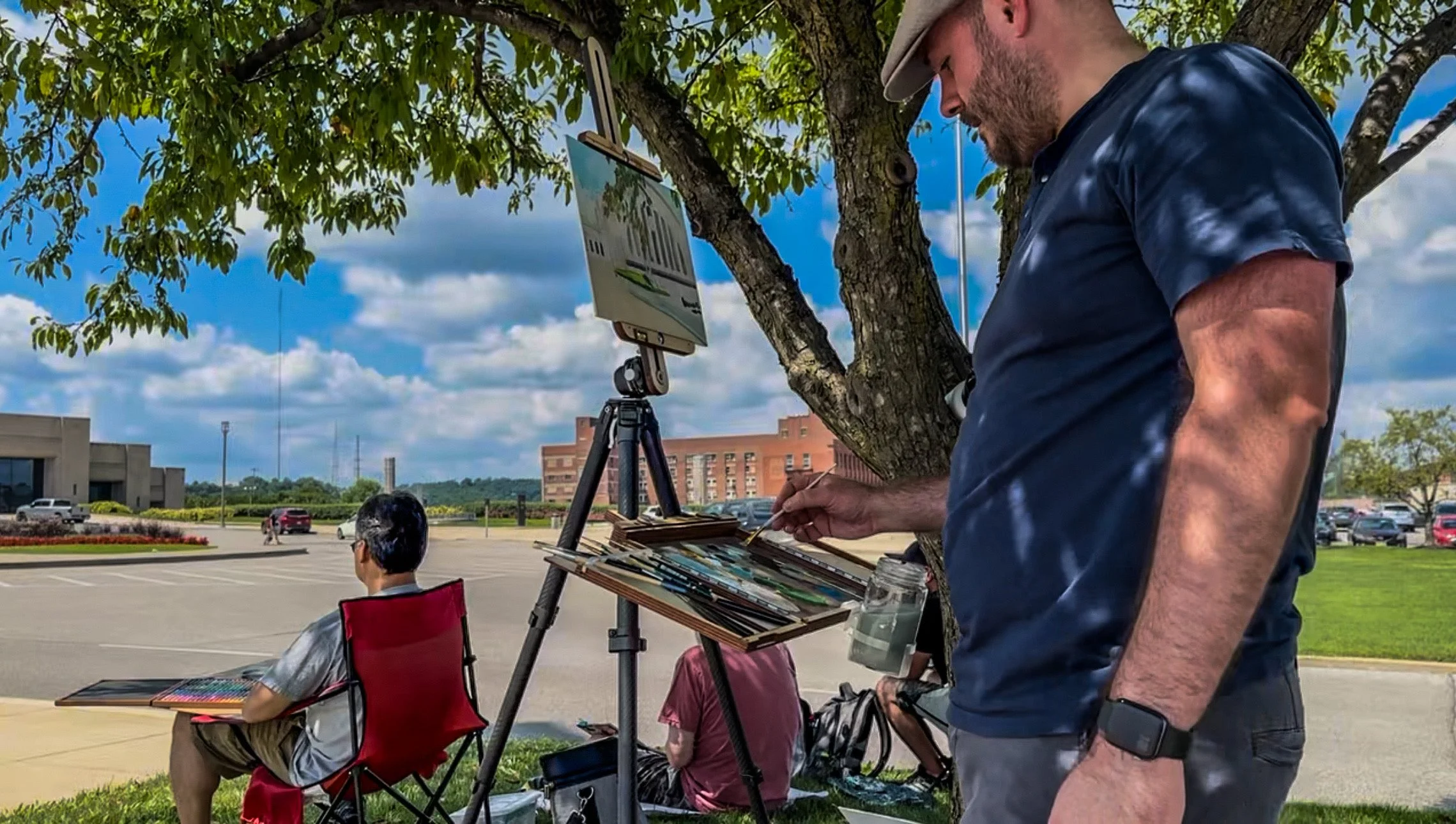 The team at Daybreak kindly sent me their Standard Daybreak Easel to try out. It’s a 9x12” palette box and panel holder kit that pairs with a tripod, featuring a beautiful design that performs just as beautifully in the field. After giving it a thorough test outdoors during some plein air painting at Cincinnati’s historic Union Terminal and later finishing the painting back in my home studio, I’m excited to share my experience.